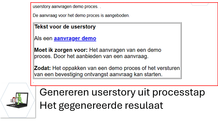 Het proces is beschreven in een model met processtappen, de condities, wie wat moet doen en wat het oplevert. Nu wil je dit snel en makkelijk omzetten naar userstories om het proces om te zetten naar een systeem dat het procesmodel implementeert.