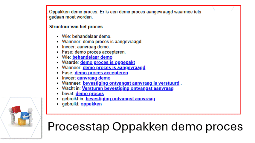 Het procesmodel is gepubliceerd met processtappen, de condities, wie wat moet doen en wat het oplevert. De gepubliceerde tekst van een processtap wordt getransformeerd naar een userstory.